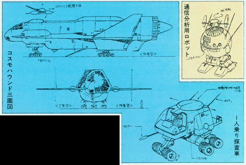 “Inside the Cosmo Hound, there is space like a warehouse for the loading of necessary equipment to suit your needs. It could be equipped with a one-person helicopter or rover, and as for personnel it can carry about twenty people. Furthermore, it has weapons that appear by sliding out, so it is possible for it to go into battle. In other words, though it is a planetary exploration spacecraft, it can be used for multiple purposes.”