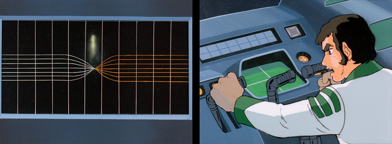 We see the lonely struggle of pilot Shima, whose fate rests in his fingertips, and the true nature of the “male bond” he shares with Susumu Kodai, who supports him. Shima’s fingers tremble as he pilots the ship, holding the fate of the universe in his hands. Susumu Kodai’s words, “We entrust our lives to you,” provides the strength to carry the ship.