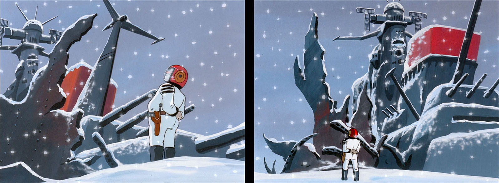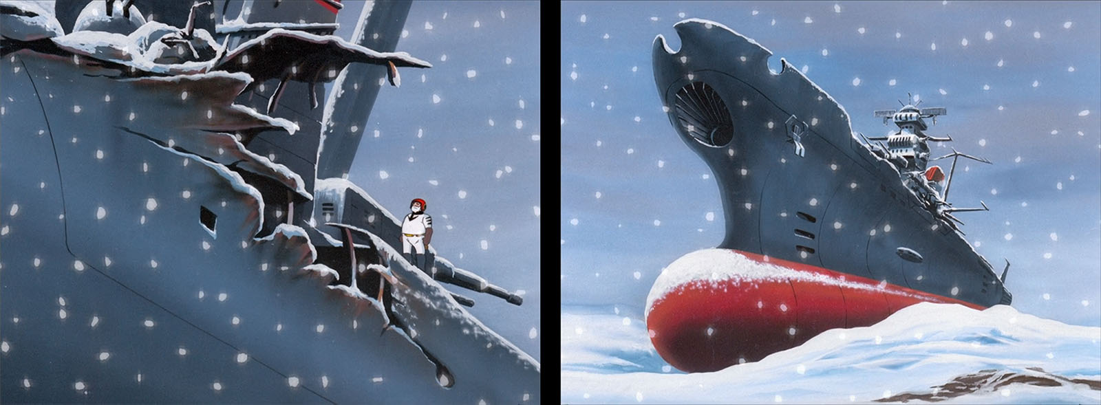 The scene after the first successful warp, a brief respite from battle and a longing for home, Earth. Combined with the winter scenery of Sapporo, this famous scene from 50 years ago takes on a new emotional impact. President Dessler, with a relaxed smile, declares, “How adorable,” pointing out the technological gap.