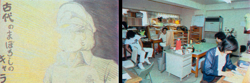 Next, the room of animation production. Animation Director Kenzo Koizumi and layout artist Kaoru Izumiguchi were working at animation tables. What was next to Mr. Koizumi’s desk? An interesting picture. It said, “Character of the Phantom of Kodai.” (photo upper left), an image of a brave Kodai wearing a hat. Come to think of it, I’ve never seen Kodai-kun wearing a hat.