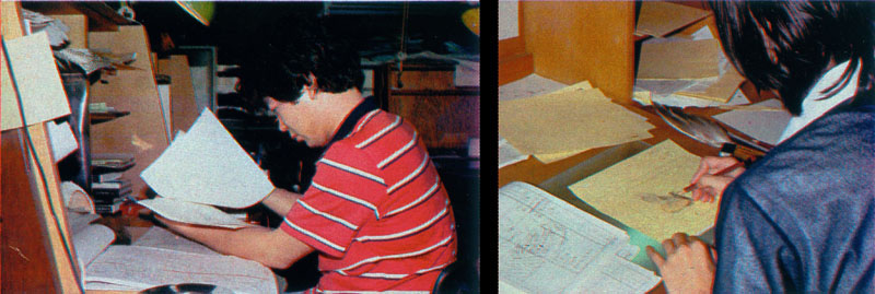 Above left: Checking a storyboard. Above right: Mr. Izumiguchi draws layouts of Yamato.