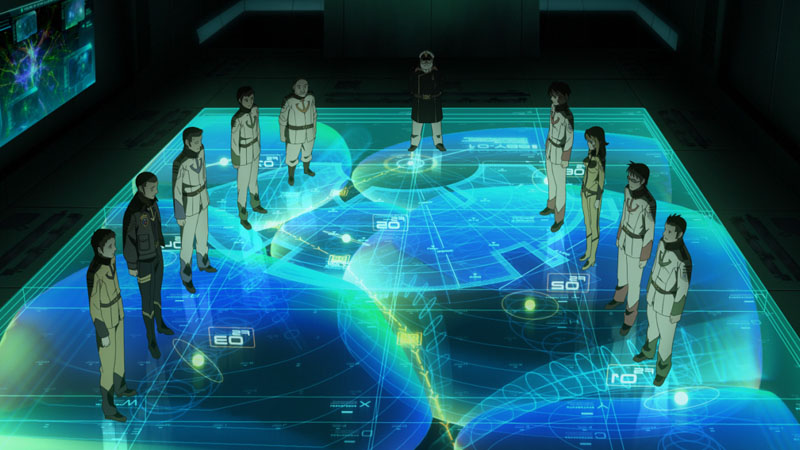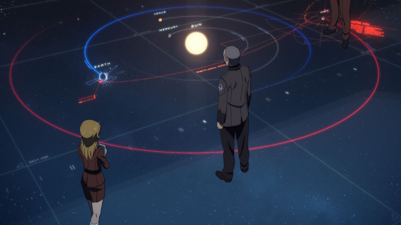 Aoki: Stereoscopic displays have definitely increased in SF. What I do most are SF information displays on floor monitors. In Episode 1, there’s an overhead shot where the crew looks at a display of the solar system (above). For this, Mr. Toshihiro Handa (a professor at Kagoshima University department of science) and Mr. Toshiyuki Takahei (of Orihalcon Technologies), who participate in scientific research for the series, obtained a diagram of planet positions in 2199. Based on that, I traced and built it in Cinema 4D to get the proper distances.