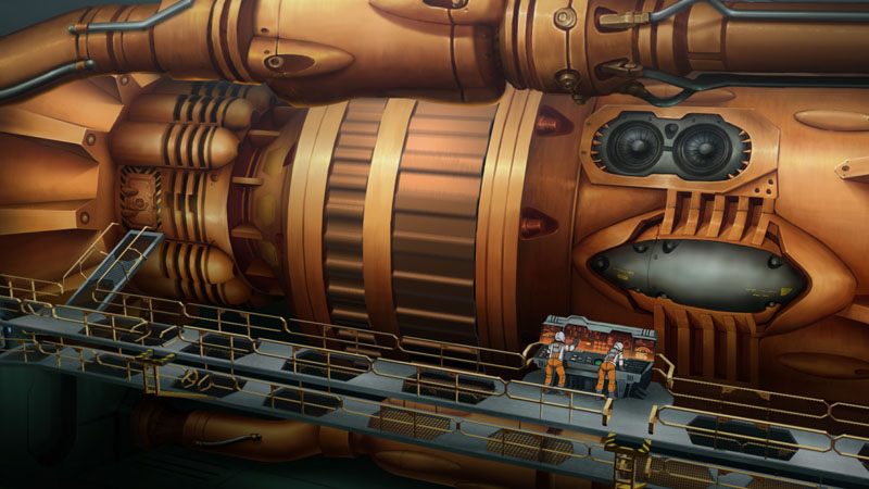 Aoki: Yamato‘s engine room was modeled in Cinema 4D, and it’s used as the basis for the layout in each scene. The customary flywheel of the Wave-Motion Engine (above) was rendered in Cinema 4D. You might expect the entire engine to be made that way, but the portion around the wheel that does not move was done in Photoshop by the background art company using the CG background as a guide, and it was finished with an acrylic paint style.