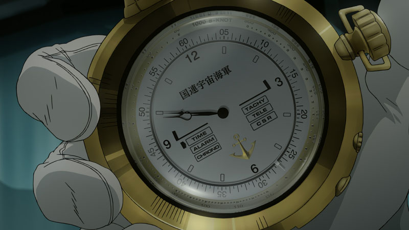 This is a slightly different example, but for the closeup of the UN Space Navy clock (below), only the clock face was done in Cinema 4D. The outside of the clock is a drawing, but we modeled it anyway so it would look good. Upon making the whole thing, we have the key animator do a rough sketch, and then have them substitute the drawing. Besides, various planets appear, so we apply textures to the spheres and use Cinema 4D to render the atmospheres and flares.