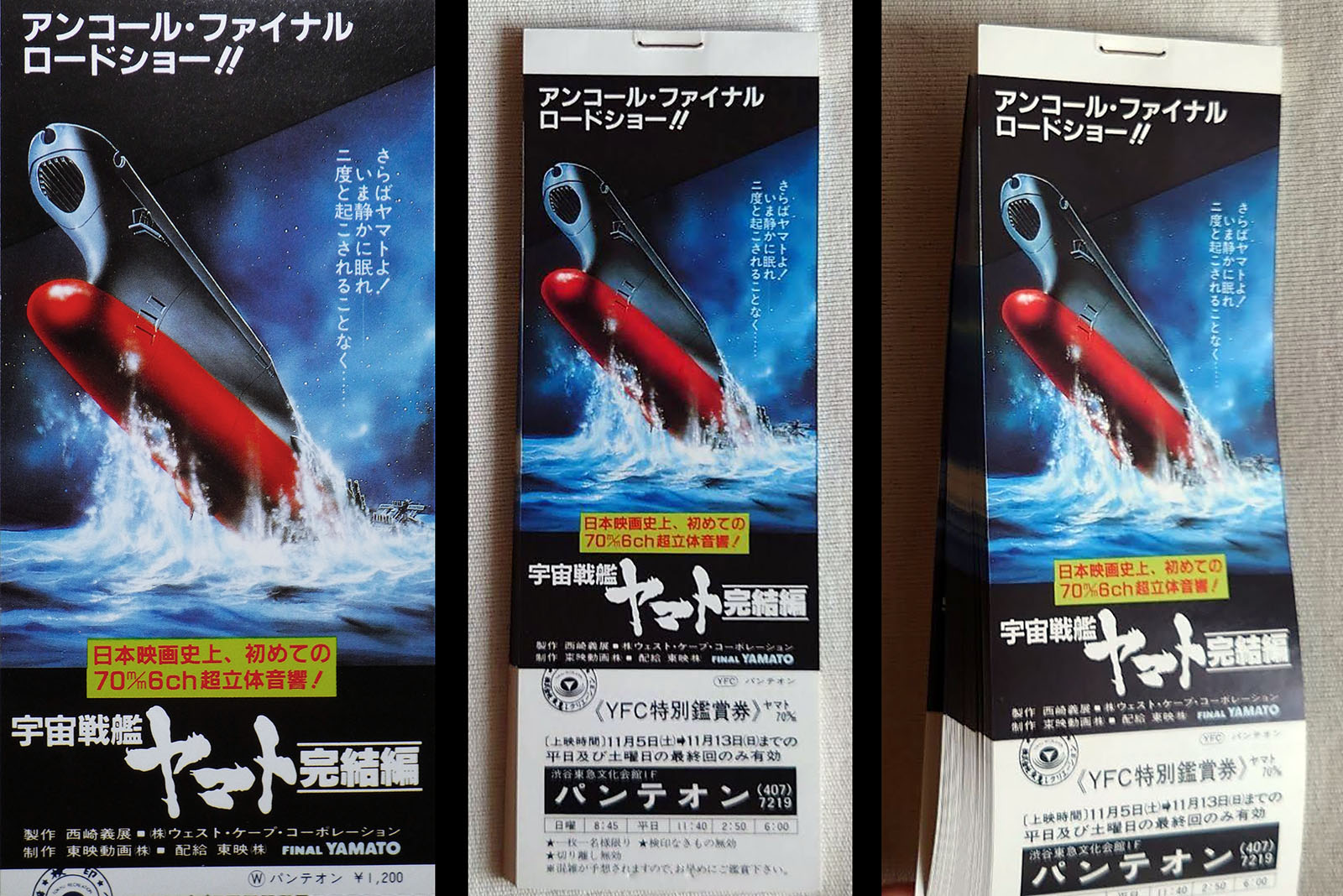 Around this time, a fresh flyer appeared in theaters with a new poster image. The text highlighted the Final Yamato upgrades, primarily the larger film size and 6-channel stereo sound. Both would be a first in anime history.
