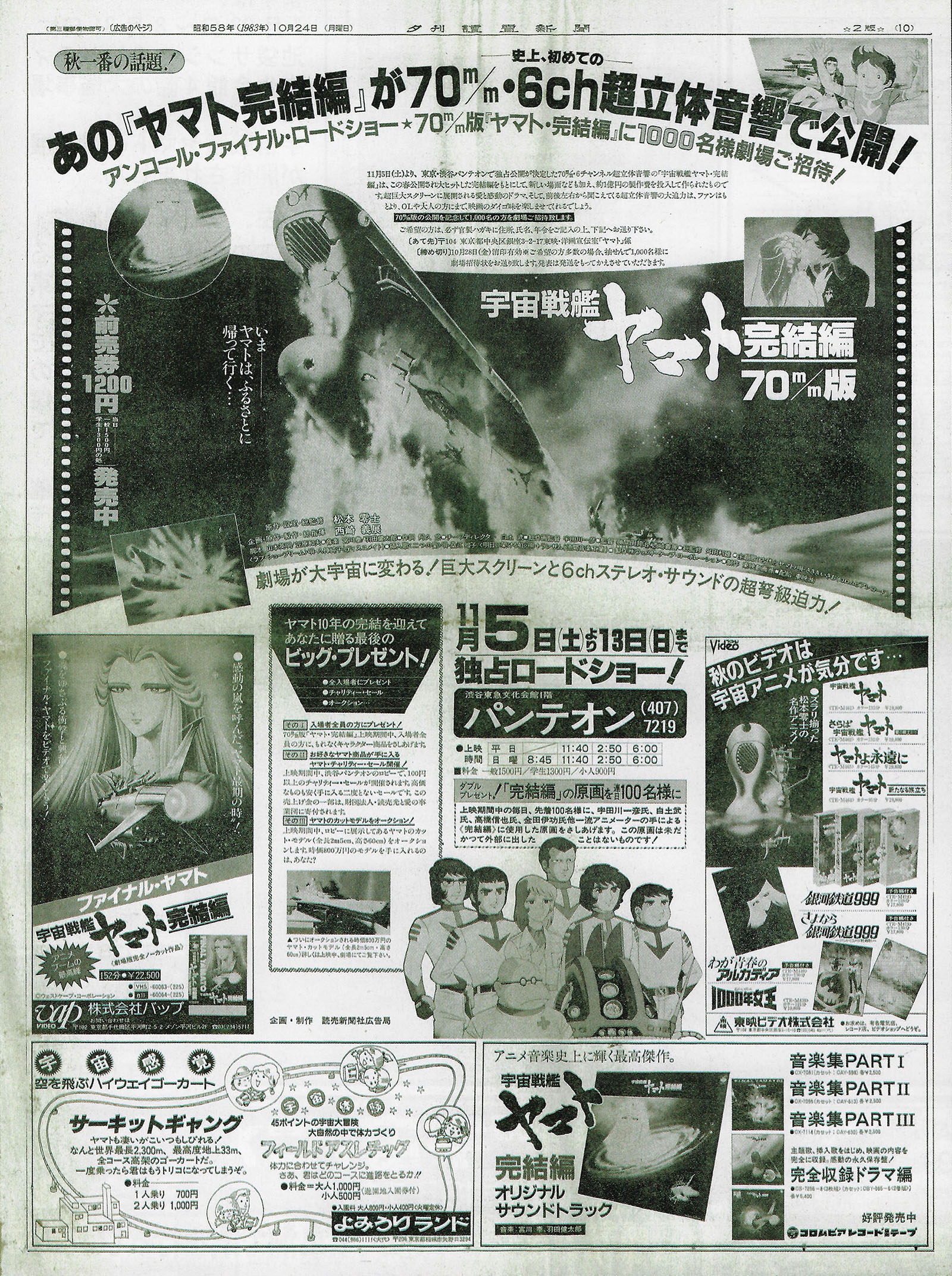 With just under two weeks to go, this full-page ad summarized all the key points of the film, focused on the premiere event at the Shibuya Pantheon theater. Advance tickets were promoted for the price of 1200 yen. The lower half contained insets for Yamato products: VAP’s Final Yamato video tape on the left, Toei’s tapes on the right, and Columbia soundtrack albums at lower right. The inset at lower left was an ad for a theme park called Yomiuri Land (which still exists).