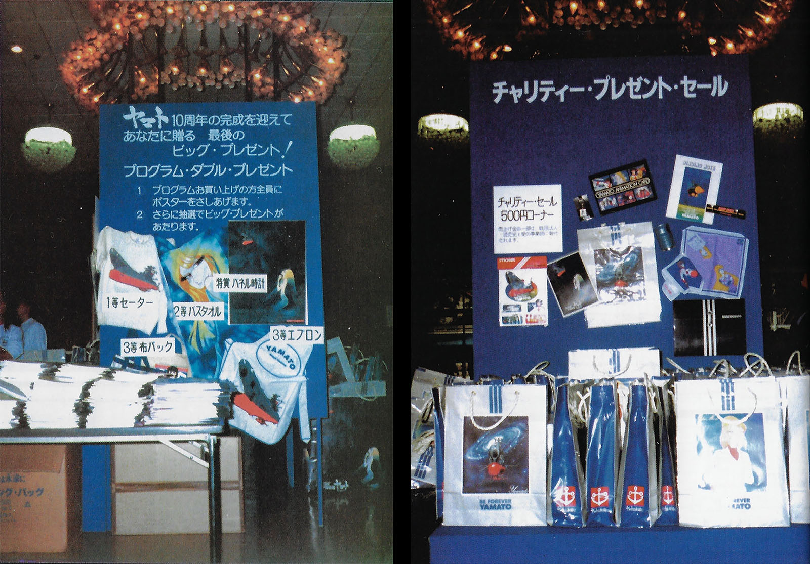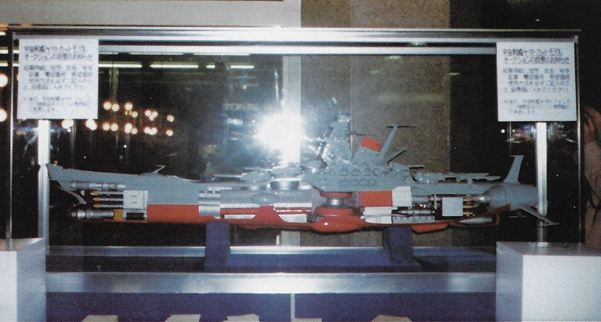Another way to obtain merch was to buy the movie program book. If it came with a randomly-inserted voucher, you could win a tote bag, an apron, or a sweatshirt. Nearby could be found a display case showing the model that was up for auction. It was, in fact, the “Precision Cut Model” that had been designed as a promotional exhibit for Farewell to Yamato in 1978. A modified version was built for Be Forever in 1980. The 1978 version was offered here with bidding ballots lined up in front of the display case.