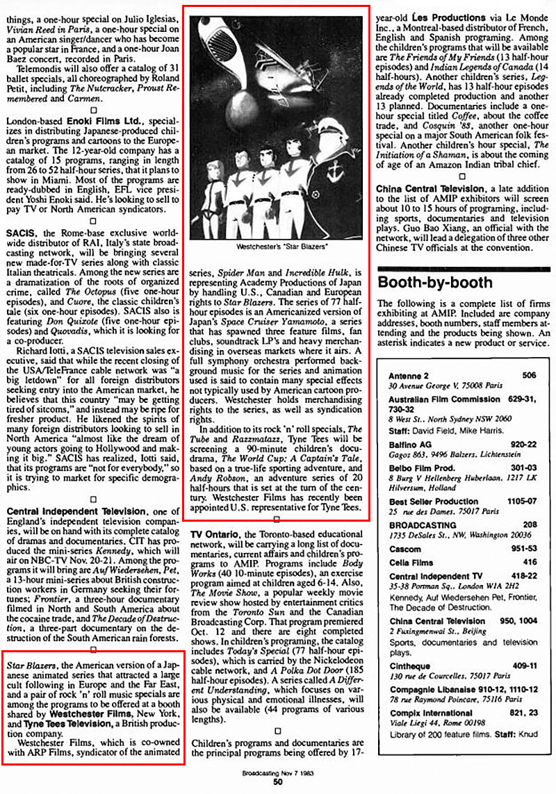 How was Star Blazers faring in the outside world at this time? One way to find out was to visit AMIP, the American Market for International Programs, a broadcasters trade show held in Miami Beach, Florida. Since it’s a bit late for us to do that, we can fall back on this article from Broadcasting magazine. The following text could be found in its profiles of AMIP exhibitors: