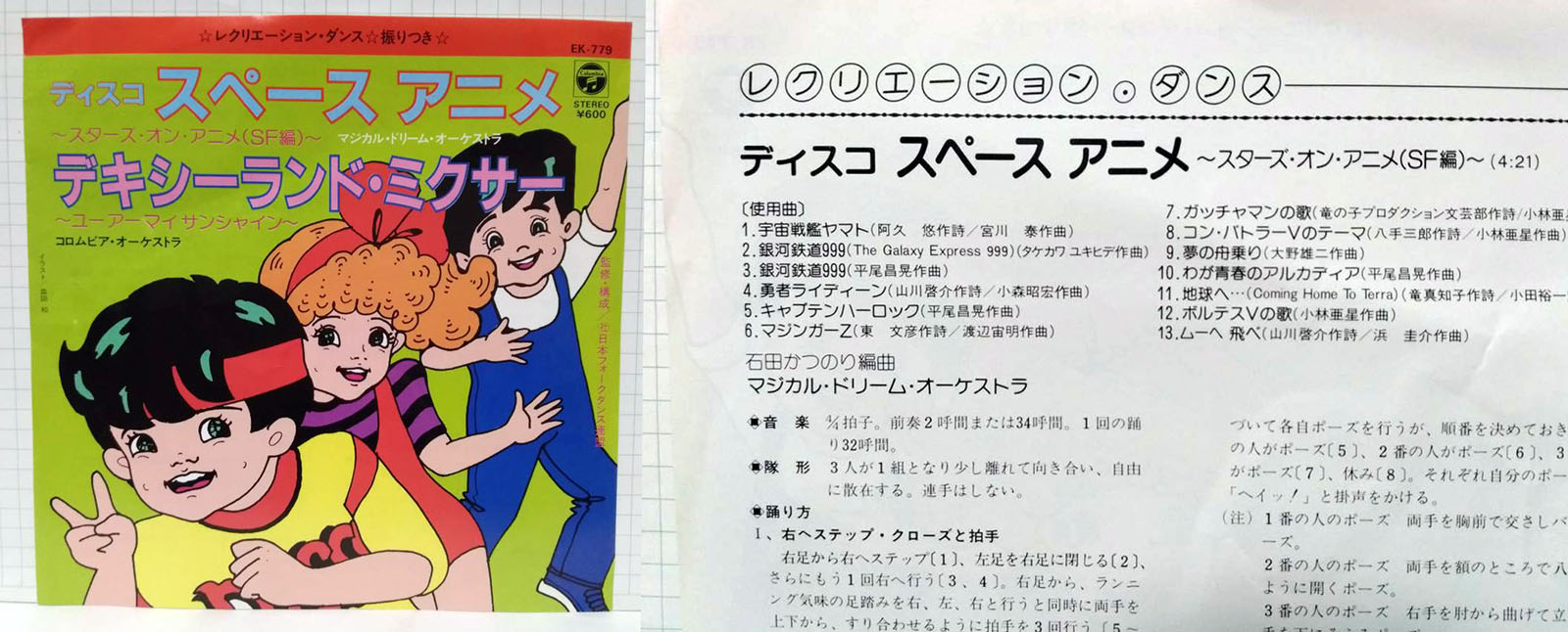 At the end of 1982, Columbia came up with another creative way to sell the same music again. Back then, it was part of a medley in Disco Space Anime, which filled up one side of a single and sampled Yamato along with Galaxy Express, Raideen, Captain Harlock, Mazinger Z, Gatchaman, Combattler V, and five other titles. A total of 13 samples crammed into just 4:21 was performed by the “Magical Dream Orchestra.” That track was reissued on the A-side of this new single. The B-side did the same with Dixieland tunes.