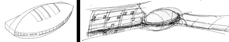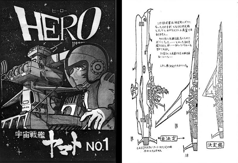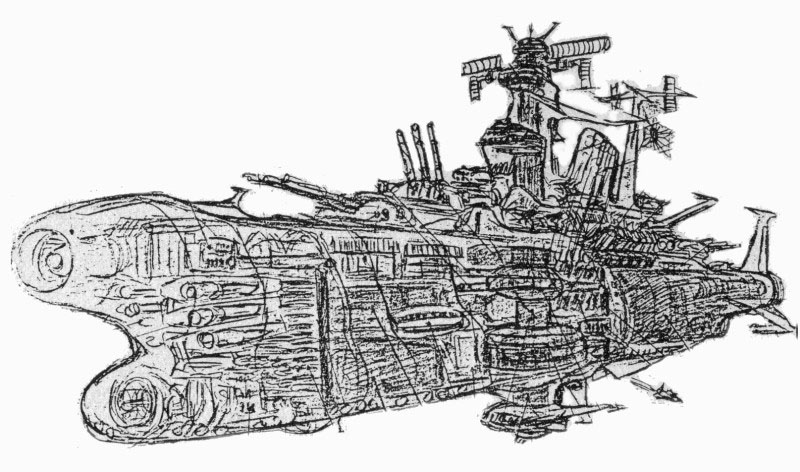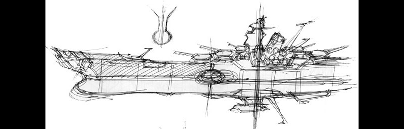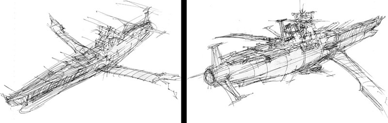 Although he had used small delta wings in the past, he did not want to break the silhouette of the Battleship Yamato in the anime design. (Early concept sketch by Matsumoto below)