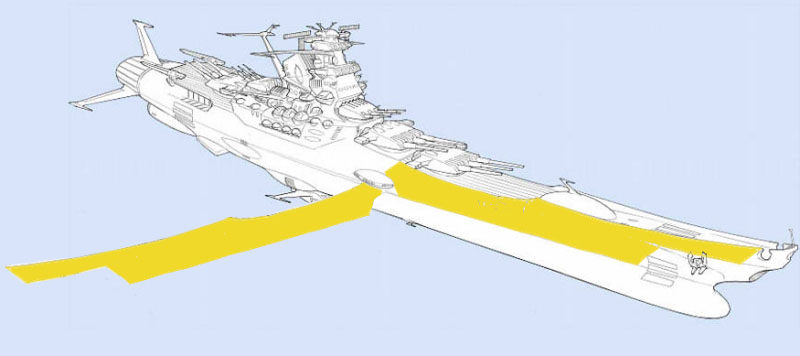 A Yamato that seems able to fly horizontally in atmosphere has now been devised. If its elongated plate-shaped parts could effectively use the armor plates from the side of the ship, so much the better.