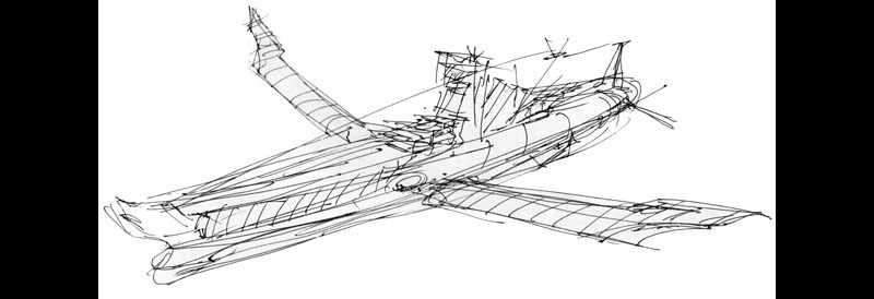 B: With huge wings, a ship cannot swim in the sea (laughs). I worked out the concept of the wingtips folding for storage in an inboard hanger.