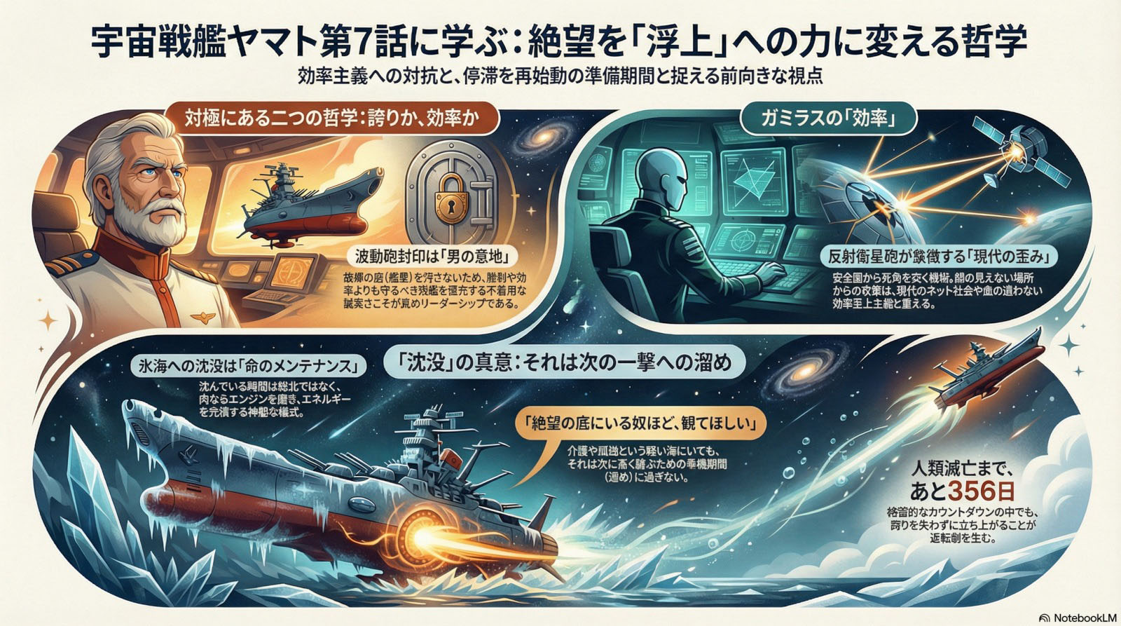 This analysis examines a paradigm shift in thinking: viewing Yamato’s submersion into the icy seas of Pluto not as a “defeat,” but rather as “recharging energy,” a strategic buildup for the next decisive strike. It contrasts Captain Okita’s proud and principled leadership with the efficiency-driven pragmatism of the Gamilas forces (specifically, their Reflection Satellite Cannon). Presented as an infographic, this piece distills a philosophy of life from the perspective of an engineer, offering a message to those navigating the “deep seas” of caregiving or personal hardship: to never lose one’s pride, and to rise back to the surface.