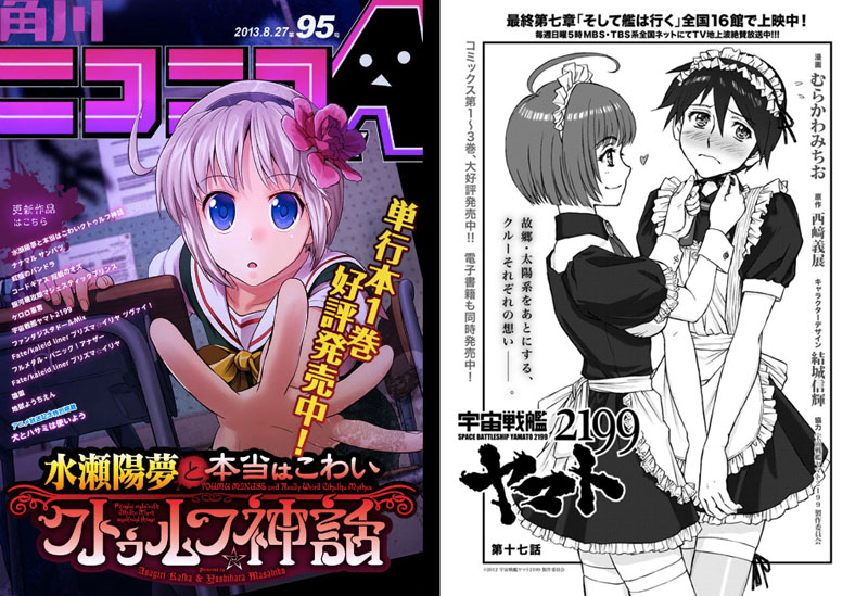 The Yamato 2199 manga adaptation by Michio Murakawa is now continuing online at Nico Nico Ace, and it’s accessible to all. Click here to find it. If you don’t have an account yet, you’ll be prompted to register; red button for a premium account at 525 yen per month, grey button for a free account. When this is done, you’ll see a starter image for Nico Nico Ace #95 (above left). Click on the arrow icon to bring up the “magazine” in a larger format.