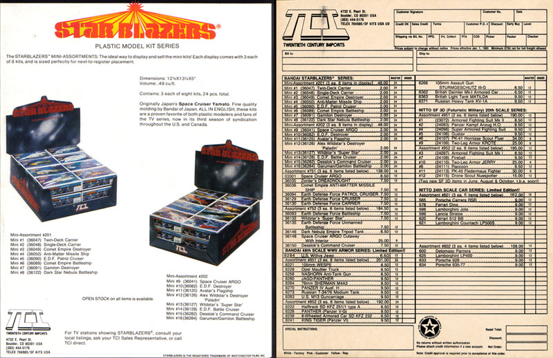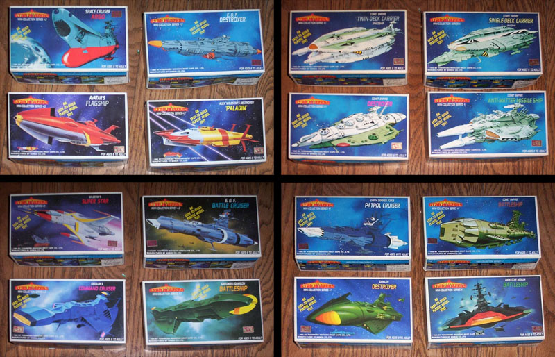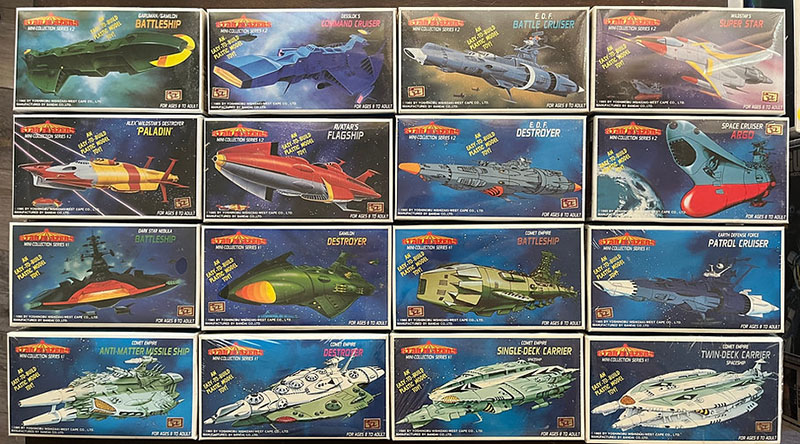 Starting in 1985, Twentieth Century Imports (based in Boulder, Colorado) brought many of Bandai’s Yamato kits to America under the Star Blazers name, which resulted in the very first mass-market Star Blazers merchandising. The kits were widely available, but it was rare to find all of them in any one place. Bandai’s box art was used, and names were updated to match their Star Blazers counterparts. Many of the larger kits included a bonus Mecha Collection mini-kit.