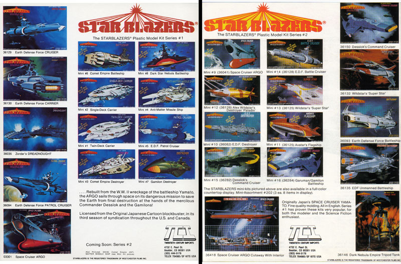 Jerry Fellows and myself were contacted to provide some translation work, because of Space Fanzine Yamato. We sat down and painfully generated ‘literal translation’ of the names of every existing Yamato model kit, then did a ‘transliteration’ pass to smooth out things like ‘Fish Thunderbolt Missile’ which properly is ‘Torpedo’, then we put everything into Star Blazers terms. I have no idea how they tagged the Superstar Fighter as Alex Wildstar, but we had no right or ability to have a check pass to make sure everything was right.