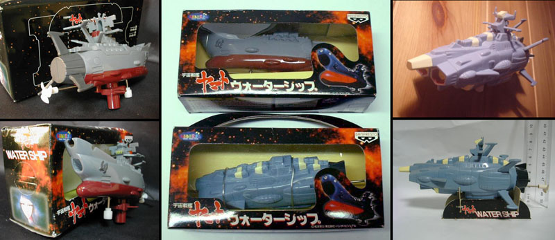 These two 6″ mini-ships, a “super-deformed” Yamato and Andromeda, were weighted at the bottom to stay upright in a pool or tub while their little windup propellers zipped them along at attack speed. That is, if any serious fan could bring themselves to get the things wet. Banpresto made similar waterships for Leiji Matsumoto’s Captain Harlock series.
