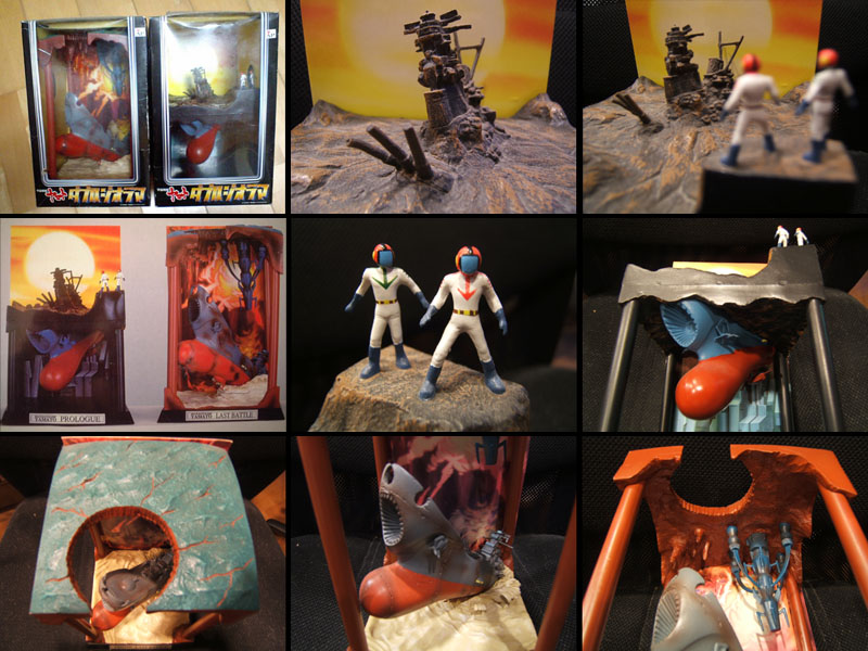 The last two items in the Banpresto toy line were certainly their finest. Sculpted with imaginative forced-perspective, they offered two fascinating snapshots from the first TV series. Diorama 1, titled “Prologue,” depicted intricately painted inch-tall figures of Kodai and Shima staring at the ancient Yamato hull above ground while the secret restoration project goes on beneath their feet. Diorama 2, titled “Last Battle” has Yamato bursting triumphantly out of Gamilon’s acid ocean, about to lay the smackdown on the empire itself. Including their cardboard backdrops, each diorama stands just under 10 inches tall.