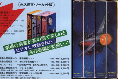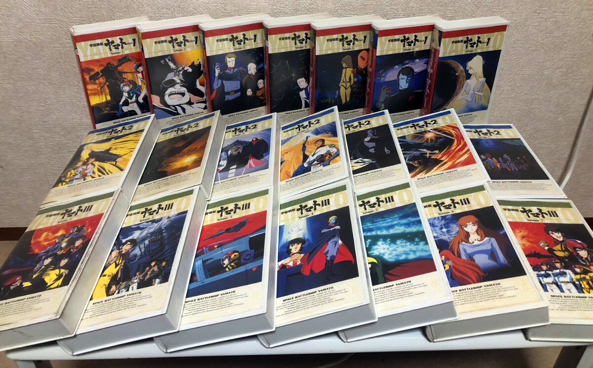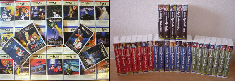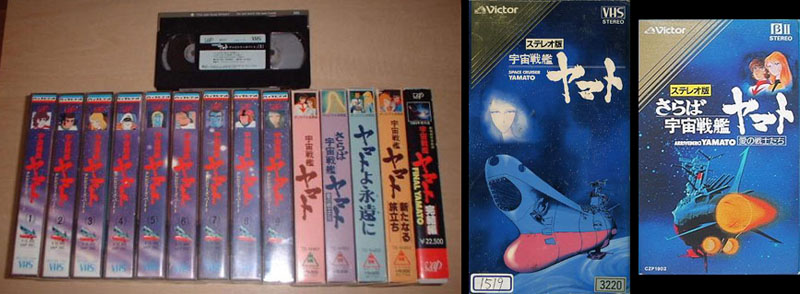 A smattering of early 80s VHS tapes. From left: the first release of TV Series 1 (9 volumes/VAP), the first four movies (Toei), Final Yamato in its 35mm form (VAP), VHS and Beta tapes from CC Victor.