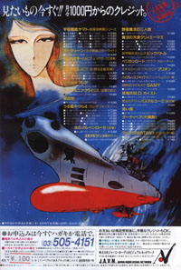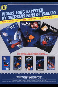 Ads for various releases. Left to right: Yamato Fan Club magazine (October 1983), an English-language flyer created for the Cannes Film Festival (May 1984), Nippon Columbia’s Music Video series (1984), and the TV compilation specials (1985). Click on each to view an enlargement.