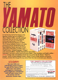 Voyager Entertainment brought the subtitled Yamato movies to DVD in the US from 2002-04, culminating with a box set that included a booklet containing a capsule history of the entire Yamato phenomenon up to that point, which happened to be the 30th anniversary year. As a matter of interest, that booklet became the core of inspiration for Voyager’s next DVD, a documentary called The Making of an Anime Legend which was released in 2005. (That documentary, in turn, inspired the ‘history’ thread that runs throughout this website.)