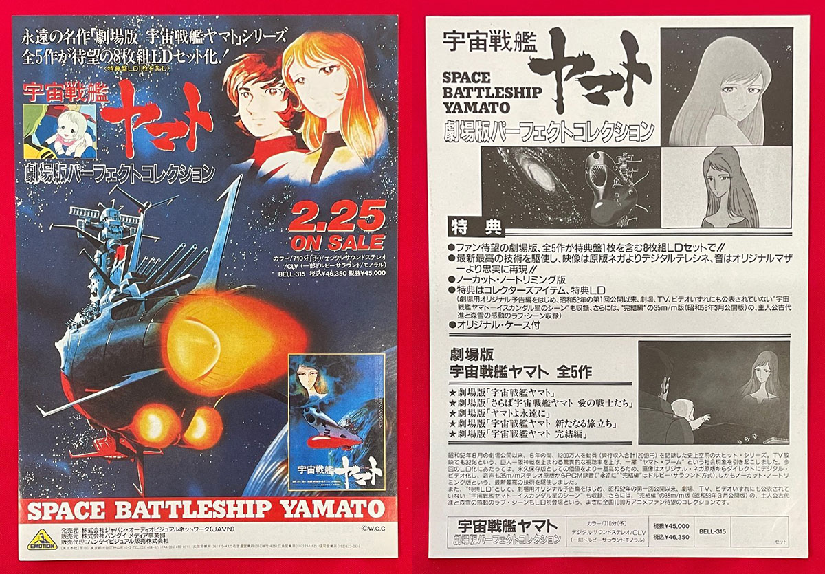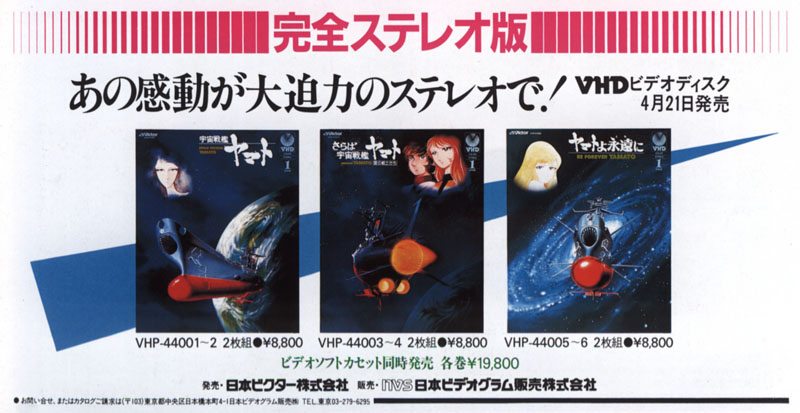 Perfection isn’t usually achieved without casualties, however, and competition created a few of those. Just as VHS had to overcome Beta, LD had VHD to contend with. A company called Nippon Victor was the first to bring Yamato to disc on this format. Proudly advertised in the Final Yamato movie program (above), Victor’s releases of Space Battleship Yamato, Farewell to Yamato, and Be Forever undoubtedly convinced early adopters that a VHD player was the way to go. Each film was spread across 2 discs and could be purchased as early as April of 1983. (Victor would also release these on VHS and Beta the following year.) The New Voyage and Final Yamato would follow in 1985, but by that time VHD had already lost the battle.