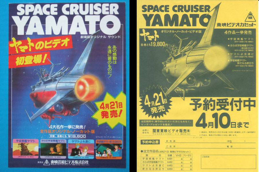 In March 1983, fans took their seats in Japanese cinemas and began flipping the pages of their freshly-printed Final Yamato program books. There, waiting to be discovered, were the earliest ads for Yamato on home video. For the first (and only) time, Yamato could be found simultaneously in a movie theatre and a store. There was little threat of competition, however, since the price of a VHS tape was roughly 100 times that of a movie ticket. Still, the future had arrived and instant access had arrived with it.