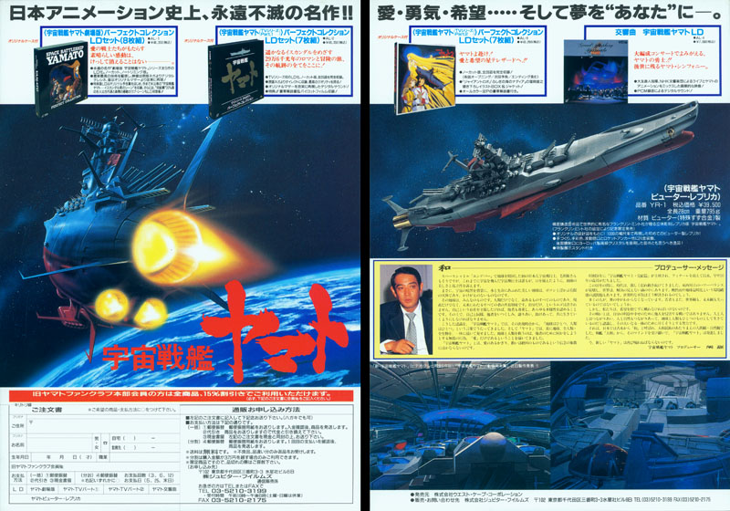 One more thing that stood out in 1993 was the first sign of a new Yamato series, also to commemorate the 20th anniversary. It was to be titled Yamato 2520, and was first tipped off on this two-sided video flyer from the official fan club. In addition to promoting laserdisc releases, it also advertised a pewter figure of the ship and a message from Yoshinobu Nishizaki about things to come. Read the whole history of 2520 here.
