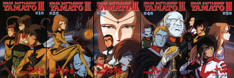 Yamato III made its first complete and proper appearance under the wing of Bandai, who by this time had acquired the entire Yamato catalog for home video release and already rolled out their landmark LD box set of the movies. All three of the TV series would emerge from Bandai’s Emotion division throughout 1990, which must have been welcome relief for fans who had been waiting patiently since Yamato III had disappeared from TV when its first run ended 9 years earlier. From the get-go, Emotion’s packaging showed creative flair with an interesting “triptych” design by artist Yutaka Izubuchi, a single image that spread across all 5 volumes (shown below). A veteran of many anime productions, Izubuchi’s prolific career in mecha design includes such credits as Xabungle, various Gundam projects, and Gasaraki. A book of his works titled Yutaki Izubuchi Design Works I was published in September, 2000.