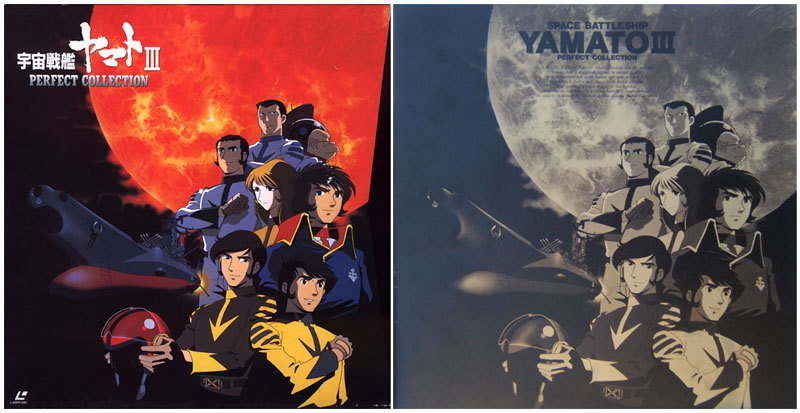 The next release of Yamato III spread the series across 7 laserdiscs with a 16-page book of liner notes, stills, a history of Yamato publishing, and “sneak peek” art for the forthcoming Yamato 2520. Emotion’s previous “Perfect Collections” had all included bonus material, and this one was no different, featuring all of the deleted scenes from The New Voyage. But as with the Yamato 2 box, the real showpiece was the amazing sleeve art by Toshiyuki Kubooka.