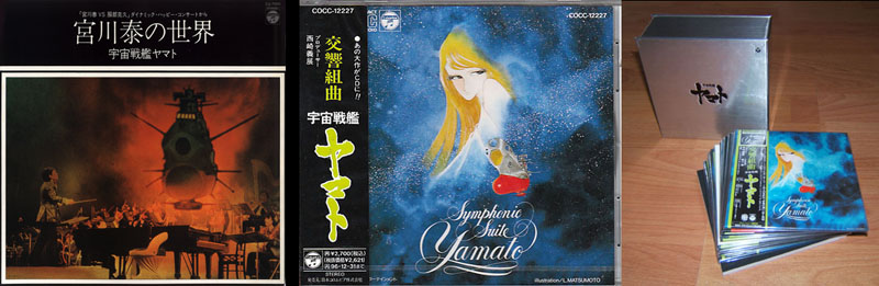 The first taste of Symphonic Suite in live concert form came on a 1978 Columbia LP titled The World of Hiroshi Miyagawa, shown above left. (Read more about that album here.) Symphonic Suite was also one of the first three Yamato albums released on CD, along with the Farewell to Yamato symphonic album and the 1984 Grand Symphony. Columbia rolled it out on three separate occasions; twice in the packaging shown above center under two catalog numbers: 32C35-7529 (1985) and COCC-12227 (1995), then remastered for the Eternal Edition Premium box set (above right, 2004). Read all about this set here.