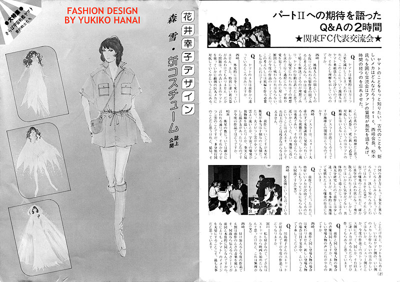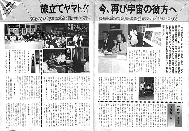 As the press and other media crowded the scene, setting off a blinding series of camera flashes, various members of the staff including Producer Nishizaki, Directors Toshio Masuda and Leiji Matsumoto, Composer Hiroshi Miyagawa, Toei PresidentShigeru Okada, Animation Director Tomoharu Katsumata and singer Isao Sasaki were in attendance. There were also over 250 members from the Kanto fan club. Fans with tape recorders and cameras gathered around the panels displaying the new battleships, tanks, costumes and character designs.