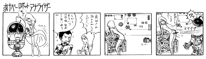 This comic strip was reprinted from a fanzine called Arcadia. The title reads “Sukebe [pervert] Robot Analyzer.” Tired of having her skirt constantly yanked up by Analyzer, Yuki asks Sandor for some technical help…