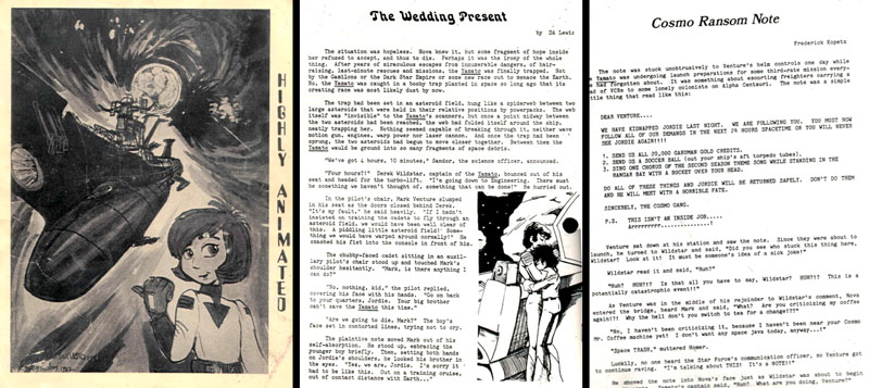 Highly Animated went on for two issues. I contributed a parody tale to issue#2 called Cosmo Ransom Note in which Jordy Venture got kidnapped. Jordy was not a popular character among the fans at that time. Ardith Carlton wrote a hilarious sequel that was printed as a companion piece to my story.