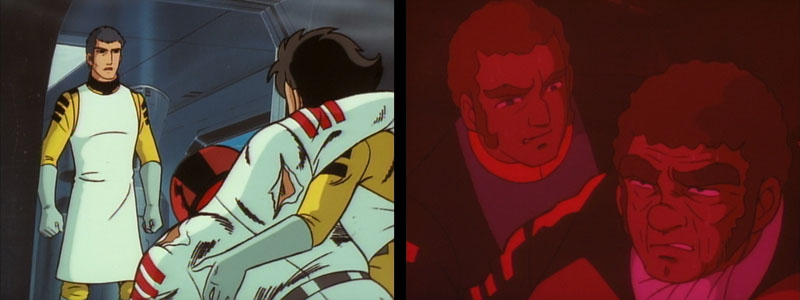 As the scene was originally written, Rysuke Domon [Jason Jetter] expresses grief and remorse over the fact that he just killed someone. Yuki [Nova] offers words of comfort. But even with the greater scriptwriting latitude Star Blazers had in the mid-80s, this situation was too heavy for U.S. TV. Thus, in the American version, Jason’s dialog reveals that the enemy soldiers were robots. Nova tells him to be thankful, because next time it could be a person.