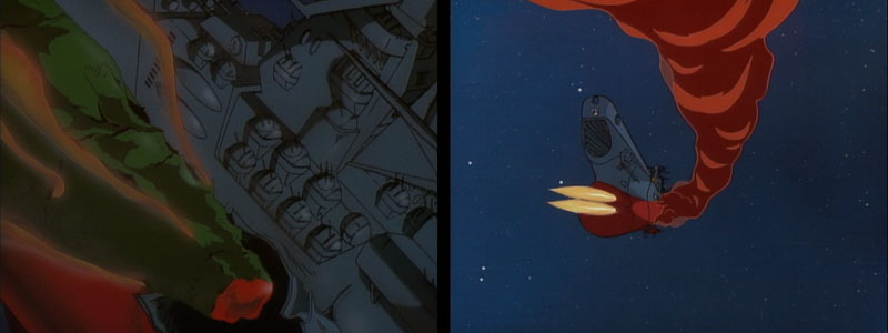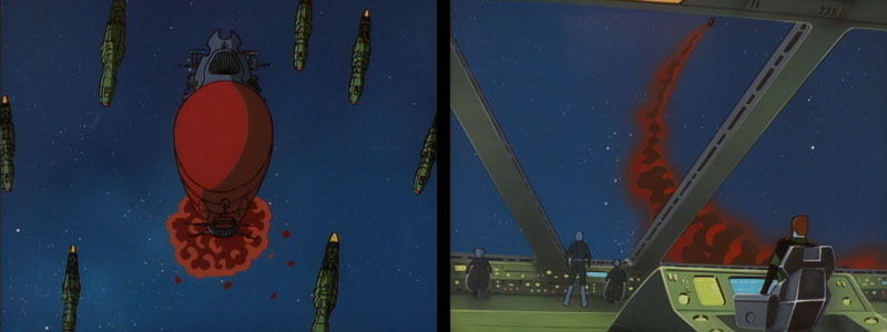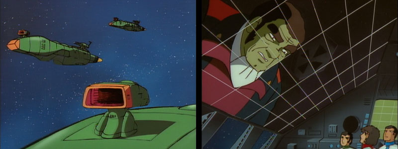 Production note: After the jump in animation quality seen in Episode 5, this one is a disappointing step backward. It has all the hallmarks of a rushed production: off-model cels, painting errors, jerky movement, etc. It’s also one solid battle sequence from start to finish, which traditionally wreaked havoc on Yamato‘s production schedule. The first red flag flies high in the opening scene (above left), which was intended to be another of those notoriously difficult double-exposures of the ship getting larger in the frame as the background recedes.