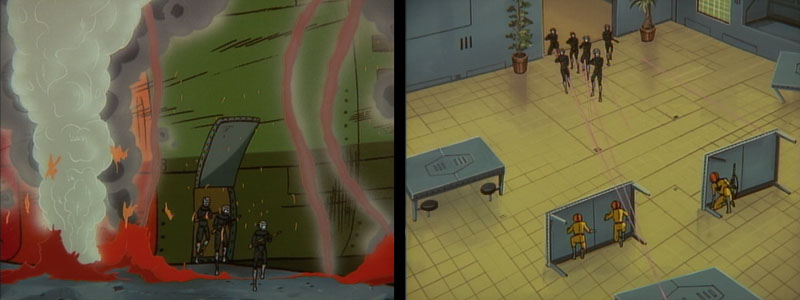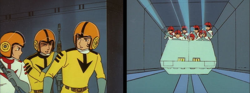 Wildstar (painted incorrectly in a Life Services uniform) and several of his men reach the outside of the mess hall where Galman soldiers are bunched together. Wildstar’s team performs a makeshift cavalry rescue, riding not galloping steeds, but a kitchen cart. Yamato III contains a few extra clips of the enemy soldiers being cut down by laser fire.