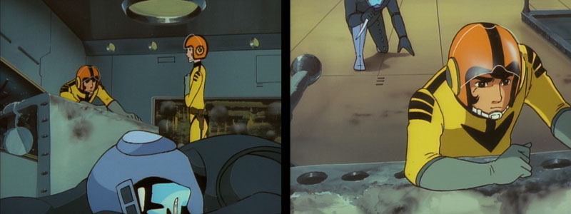 Given the drama of the episode, Star Blazers scripter Peter Fernandez must have wanted to lighten the mood. This would account for some of the script oddities. Immediately upon impact, a Galman officer falls to the floor. It’s not quite clear, but I swear a voice from off screen says “Ouch! I just stubbed my toe!” While I’m a bit uncertain of that, there’s another bit of attempted levity that’s less ambivalent: an engine room worker tumbles on top of Orion with a giggle.