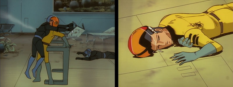 This is a powerful episode and maintains a nice pace throughout. Captain Ram received an admirable death scene, and Jason’s swift, impulsive shooting of an enemy soldier was appropriately intense and dramatically staged, in spite of the “robot soldier” explanation that followed in Star Blazers. The death of Hardy was barely noticeable in the original Star Blazers cut, but is given more weight in the remastered DVD version.