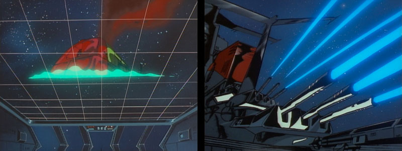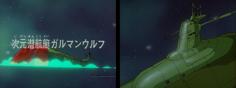 Suspenseful music takes us to an empty view of space, broken by a neon-blue wisp of flickering energy. From out of this energy, the tip of what looks like a periscope appears. The energy expands, shifting and flowing like water, and a Galman “Dimensional Submarine” emerges. Several more subs “surface” nearby. As the subs proceed toward the fortress of the Galman Empire Eastern Task Force, blue energy streams flow along the ships’ horizontal midlines like a water wake.