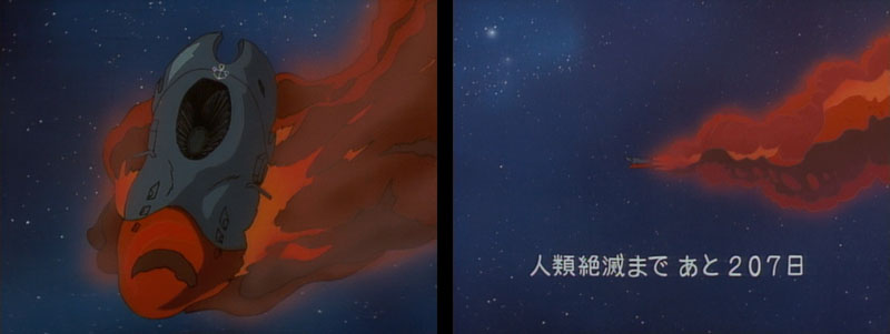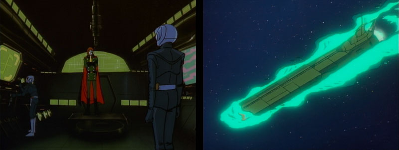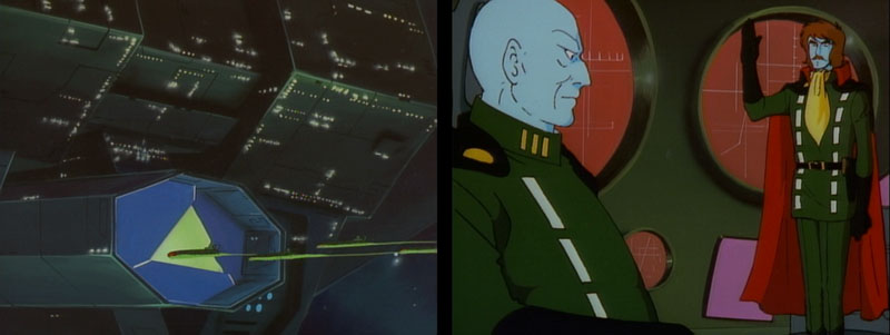 Production note: for Frakken’s first appearance in Yamato III, he was to be shown in his standard uniform out on the exterior deck, his cape blowing in an imaginary wind. Fledgling designer Yutaka Izubuchi objected to this, and the result was to outfit Frakken with a space suit instead. Izubuchi further objected to the cape blowing in the wind, but was overruled by Exec Producer Nishizaki who insisted that this was the Yamato style. There was already an example of Dessler standing out on the deck of his ship (at the end of The New Voyage) with no visible protection against the vacuum of space, his cape fluttering dramatically. We could speculate that he was standing inside an atmospheric envelope with a continuous air current, but the simple fact was that it looked cool. That made it artistically correct. Frakken got the same treatment with his cape, but evidently only Dessler is cool enough to stand outside in space without a suit.