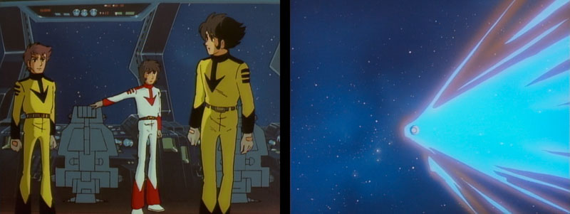 Wildstar makes his report to Commander Singleton [Heikuro Todo]. The Star Force has inspected two more planets, N808 and P3249, but oxygen and moisture levels were too low to support Earth’s population, respectively. In Yamato III, only planet N808 was mentioned. The original episode contained several seconds of silence as technicians updated their star maps, which the American script filled in with info about the second planet.