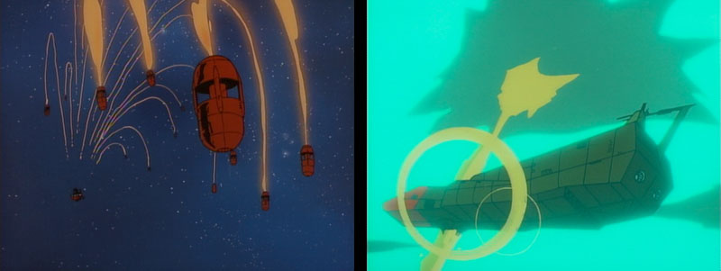 Story note: the dimensional submarines stand as the most unique SF concept to come out of Series 3, but the physics of subspace itself are rather vague. The terminology indicates that it is another dimension, but it isn’t referred to as the perennial “fourth dimension,” which we heard about back in Series 1. It also seems to have the same scale as normal space; the distance to other objects is consistent whether you’re above or below the “waterline.” (Despite one scene that shows three periscopes in much closer proximity to each other than would be possible in “real space.”) This was, of course, based on the easily-understood 3-dimensional relationship between boats and subs in the water and was probably limited to that so it would be easy to grasp. However, when the idea was further developed for Yamato Resurrection, the true advantage of subspace was realized when Yamato‘s enemy “surfaced” to attack from unpredictable angles and directions.