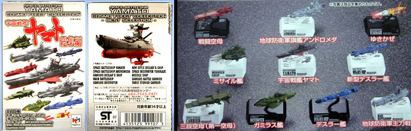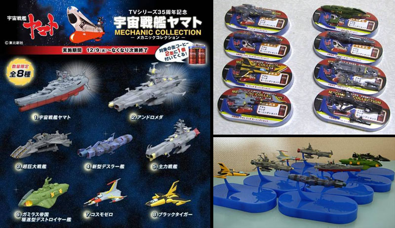 Lawson, one of the bigger convenience store chains in Japan, surprised everyone with this new Mechanical Collection in early December, eight ships released as part of a canned-drink promotion. Each could be mounted on its own stand or combined in the separate domed display base. This was the first Yamato product to tie in with 2009’s 35th anniversary of the first TV series, hopefully a sign of special commemorations to come. Lawson upped the ante with a hilarious TV commercial, which can be seen here.
