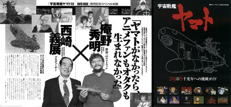 Magazine coverage of the DVD box followed quickly. First out of the gate was Japan’s Weekly Playboy, which carried the first interview in a decade with Yoshinobu Nishizaki, in conversation Yamato superfan/Evangelion creator Hideaki Anno. Read a complete translation here.
