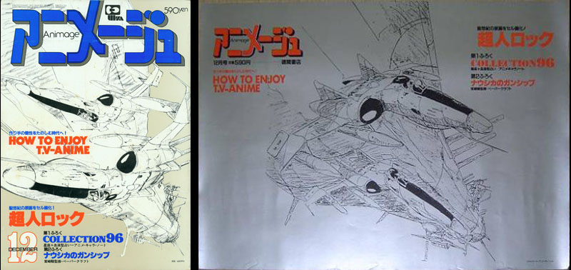 Fans were probably never at a loss for “how to enjoy TV Anime,” but this issue of Animage grappled with the topic anyway, using it as a year-end examination of everything on the airwaves. Yamato wasn’t on TV at the time, but a report on the forthcoming Final Yamato earned it another cover with spectacular artwork by Yoshinori Kanada. It was also used in slightly altered form on a commemorative poster, shown above right. This would soon be repeated with another Kanada cover in April 1983.