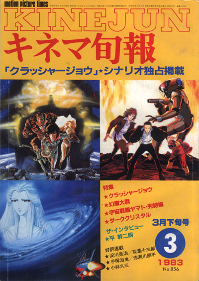 Yamato‘s third cover story on Kinejun shared space with the other two anime blockbusters for ’83, Crusher Joe and Harmagedon. The Final Yamato coverage included 9 pages of stills and analysis.