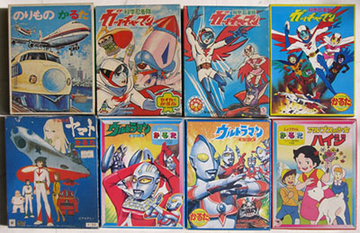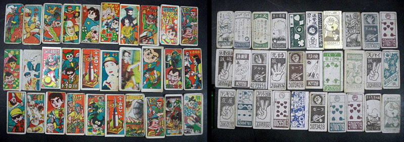 Before the Yamato boom of the late 1970s, the closest thing most kids could get to an anime game was a set of Menko cards with TV or manga characters on them. Quick and easy to make (just ink on cardboard), they were run off by the millions, often with bootlegged or hand-copied images in lurid colors, all made possible by a lackadaisical attitude toward copyrights and licensing. A Menko game was similar to marbles, with two or more players throwing cards at other cards to try and win the most.