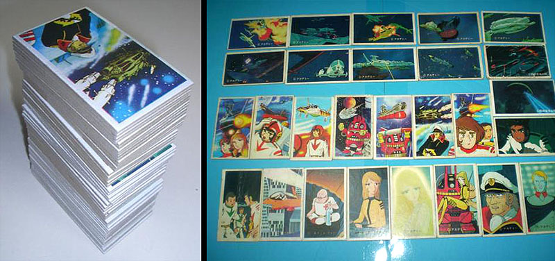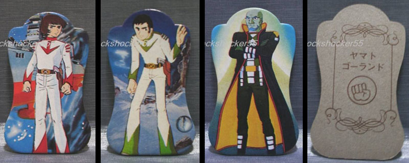 The first steps were cautious ones, staying inside the comfortable realm of paper products during the release of Farewell to Yamato in 1978. There were Menko cards in both the classic rectangular style and more production-heavy diecut shapes shown below. (For one thing, the manufacturer had to separate them rather than doling them out in sheets that kids would have to cut apart themselves.)