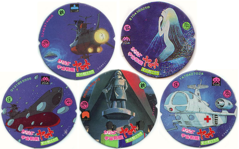 All the Menkos shown here were made by the Amada company, who also produced trading cards. The added graphics around the rim enabled a word game, jan-ken-pon, and apparently an analog version of Space Invaders. This was not by chance; Japan was so swept up by the famous video game in 1978 that it created a nationwide shortage of 100-yen coins. It should also be pointed out that Yamato was not alone in the world of Menko discs; Amada also had licenses for Leiji Matsumoto’s Captain Harlock and Galaxy Express 999.